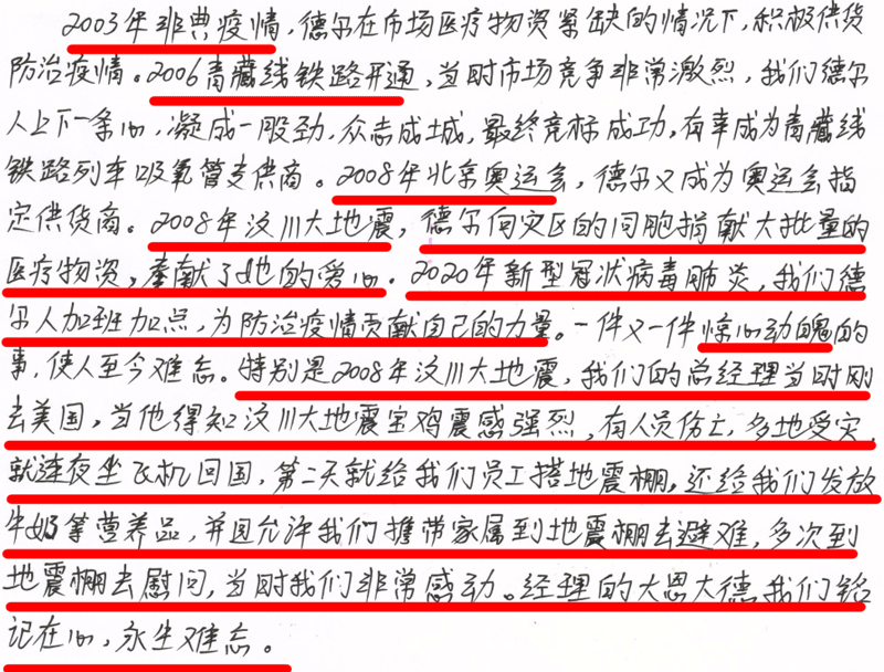 2008年,對(duì)于我們每一個(gè)中國(guó)人,是不平凡不同尋常的一年,也是沉痛的一年,更是難忘的一年。那年發(fā)生了震驚世界的5.12汶川大地震。那幾天電視天天報(bào)道災(zāi)難帶來(lái)的不幸,以致每天心懷悲痛的看著電視上的傷亡情況。一次無(wú)意識(shí)的看電視機(jī)會(huì),我看到了寶雞電視臺(tái)采訪我家張華總經(jīng)理,我激動(dòng)的喊我父母過(guò)來(lái)看,因時(shí)間久遠(yuǎn)具體記得不太清楚了。但講述的內(nèi)容至今歷歷在目。是張總經(jīng)理以德?tīng)柟究偨?jīng)理的身份為我們四川受災(zāi)同胞捐款的事跡。當(dāng)時(shí)高三的我就覺(jué)得這是很偉大的愛(ài)國(guó)情懷和忘我無(wú)私的愛(ài)國(guó)情操,心系受災(zāi)群眾,為國(guó)家為人民貢獻(xiàn)自己的力量。讓多日以來(lái)沉重的心情受到些許的感動(dòng)與溫暖。災(zāi)難無(wú)情,人間有愛(ài),希望就在眼前!