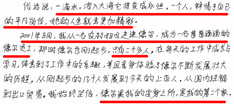此刻我想起了第一次德爾的情形,那是2006年。當(dāng)時(shí),我們普通員工的工作服是類似于醫(yī)生的白大褂,有些零件還需要訂購,工廠也不是很大,沒有場(chǎng)面的混亂,也沒有人員的抱怨,這給我留下非常深刻的印象,它讓我看到了這是一個(gè)團(tuán)結(jié)一致、彼此依托、共同進(jìn)步的集體。讓我對(duì)公司的敬意油然而生。但在這短短的十幾年里,工廠發(fā)生了翻天覆地的變化,我們的工作服變得更加的正式正規(guī),變得越來越專業(yè),公司的管理制度也越來越人性化,有了自己的廠房,零件也完全有能力自行生產(chǎn)。