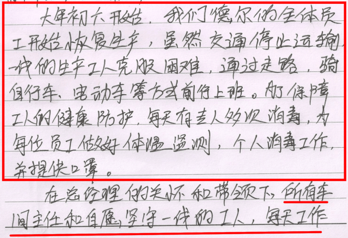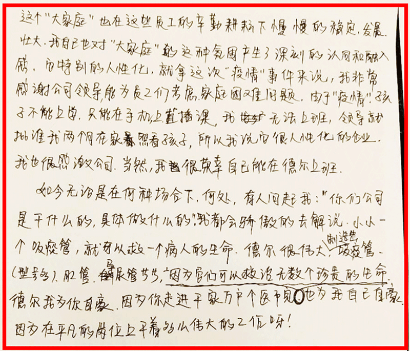 今年是特別的一年,是全國(guó)人民最難忘的一年。由于疫情的原因,許多醫(yī)務(wù)工作者和企業(yè)都在奉獻(xiàn)自己的微薄力量去抗擊疫情。德爾作為醫(yī)療企業(yè)同時(shí)也承擔(dān)了自己的企業(yè)責(zé)任。過年期間,公司在保障員工自己安全,同時(shí)生產(chǎn)了許多醫(yī)療器械,救助那些不幸被傳染的患者。讓我最感動(dòng)是,過年期間由于疫情的原因交通也不方便,同事還有他們的家人用自己的車來接送我回家,后來經(jīng)理也用自己的車接公司的員工回家,這讓我感受到德爾大家庭的溫暖。