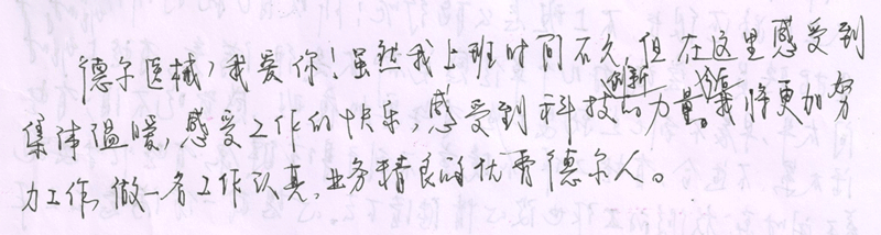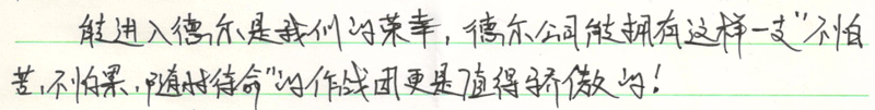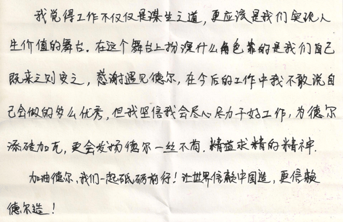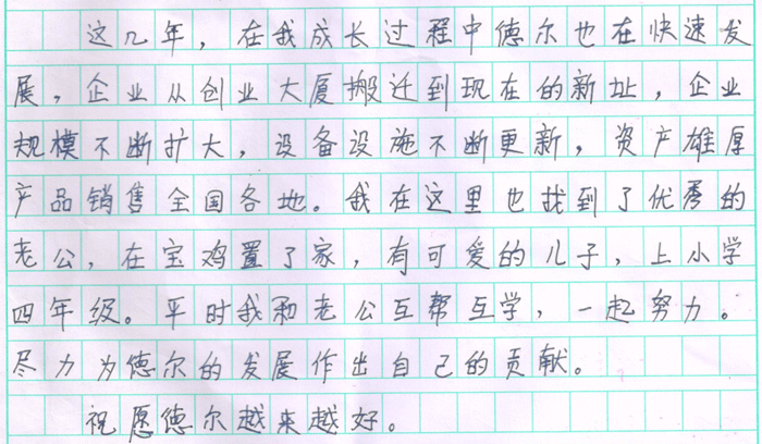 我很感謝德爾給了我工作的機(jī)會,不僅可以增加家庭的經(jīng)濟(jì)收入,而且也讓我深刻的認(rèn)識到自己工作的重要性,同時也讓我明白了自己的價值所在,在以后的工作中,我仍然會認(rèn)真的對待自己的工作,認(rèn)真生產(chǎn)每一件產(chǎn)品,繼續(xù)把工匠精神發(fā)揚光大。